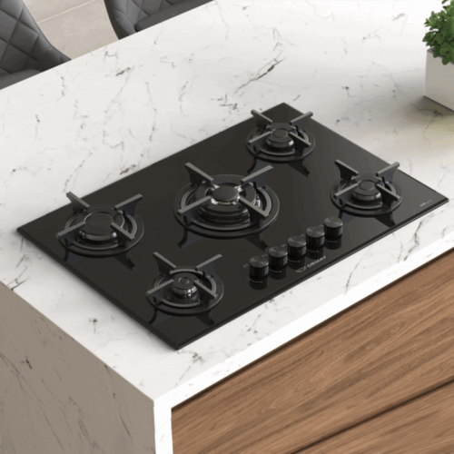 Ofrece cinco hornallas con encendido eléctrico y diseño moderno en vidrio negro. Con 75 cm de ancho, es ideal para cocinas amplias. Apto para múltiples tipos de gas y con eficiencia energética A.