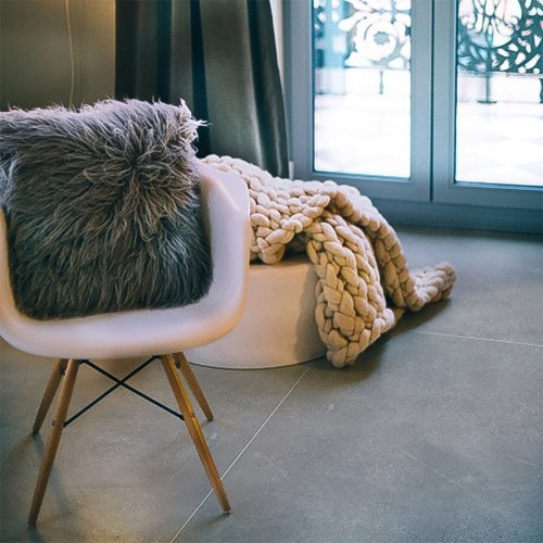 Porcelanato de formato rectangular de 80cm por 80cm, de color gris con acabado natural. Posee bordes rectificados para una sensación de mayor continuidad y amplitud en la superficie debido al menor espacio de juntas entre los porcelanatos. Se recomienda su uso, por su modelo, para ambientes como oficinas, livings y dormitorios.