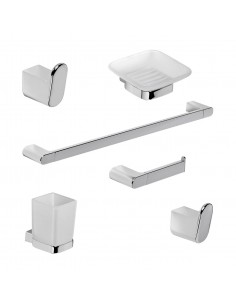 Incluye: Percha, Aro toallero, Barral toallero, Porta rollo, Jabonera, Porta vaso y cepillos.
