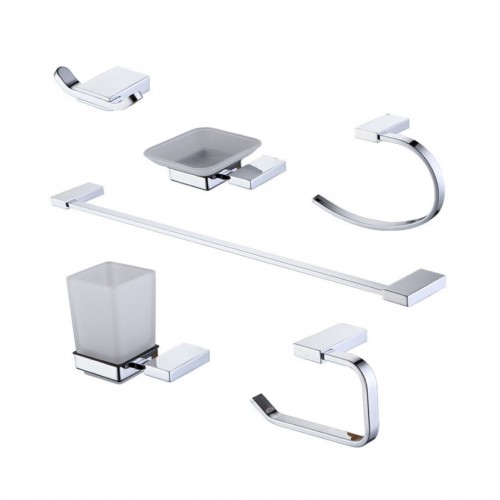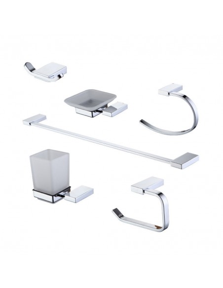 Set completo de 6 accesorios Peirano Línea 13006 con diseño cuadrado y terminación cromada. Ideal para ordenar el baño con un estilo moderno y duradero.