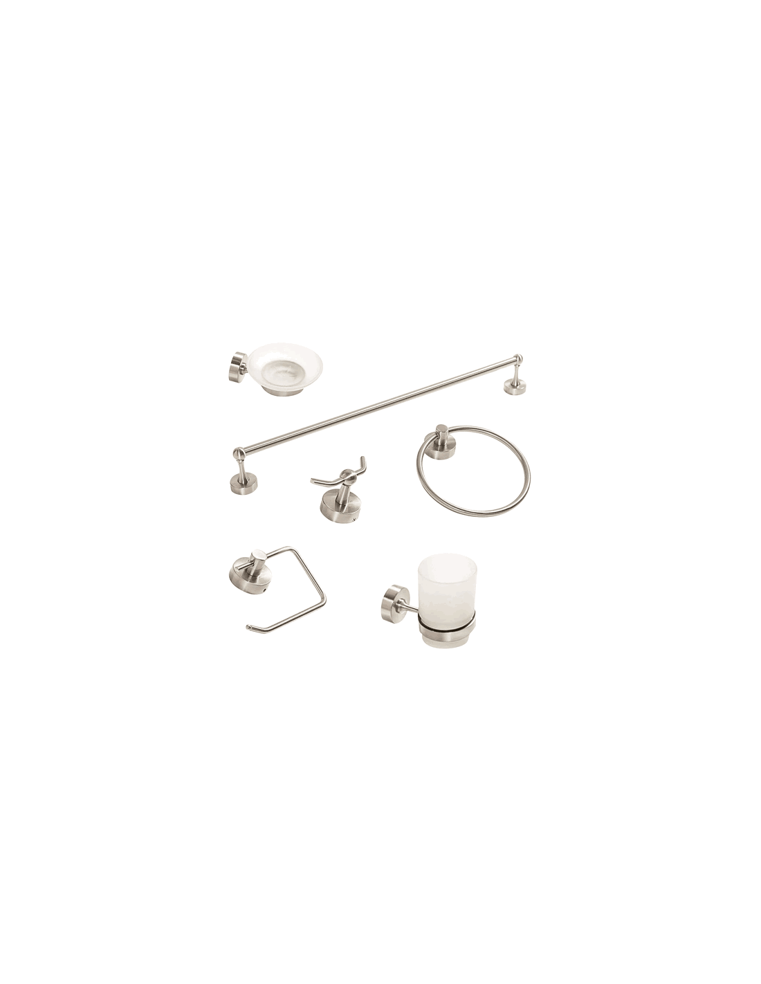 Este set incluye portarrollo, porta vaso, jabonera, aro toallero, barral toallero y percha, ofreciendo todo lo necesario en un solo kit. Una solución práctica que aporta armonía y calidad al baño.
