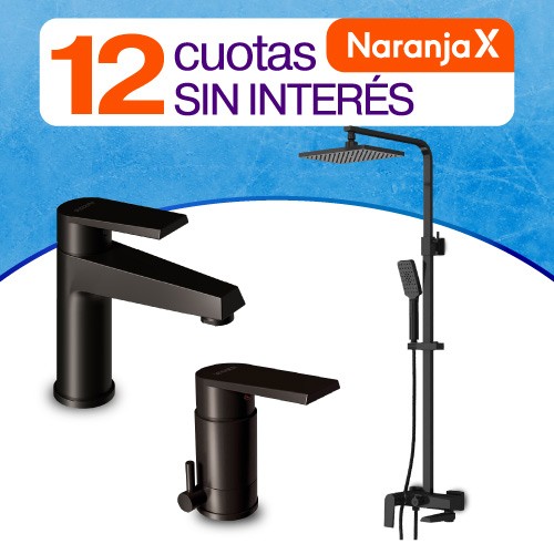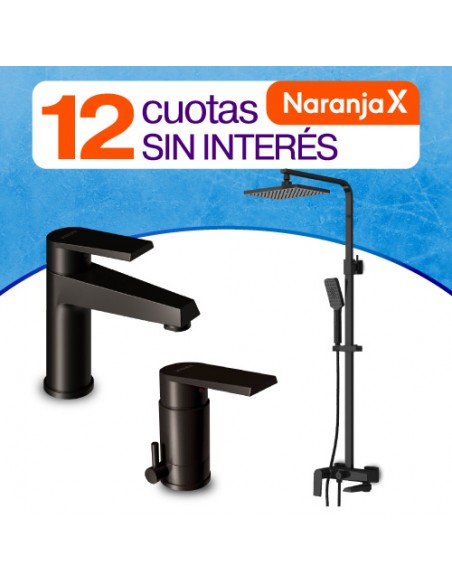 El Combo Grifería Zafiro Monocomando Negro Bajo Vasser combina diseño contemporáneo con materiales de alta calidad. Incluye griferías para lavatorio, bidet y ducha, todo con un elegante acabado negro mate que transforma cualquier espacio.
