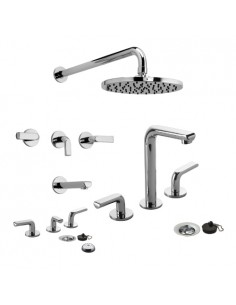 Incluye griferías para lavatorio, bidet y ducha, todas pertenecientes a la línea Libby, asegurando una estética uniforme en todo el ambiente.