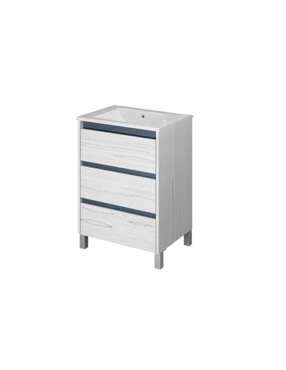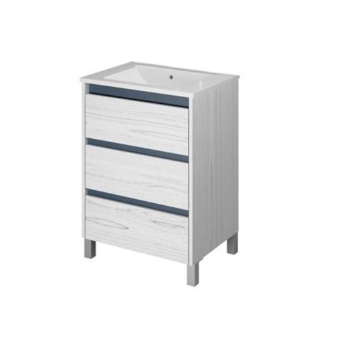 El mueble cuenta con tres amplios cajones de apertura suave, ideales para mantener tus objetos organizados. Está fabricado en melamina resistente a la humedad, lo que garantiza durabilidad y fácil limpieza. Su formato de apoyar brinda estabilidad y una instalación práctica. Además, incluye una bacha de apoyo Aqualine, moderna y resistente, que completa el conjunto con un diseño equilibrado y funcional.