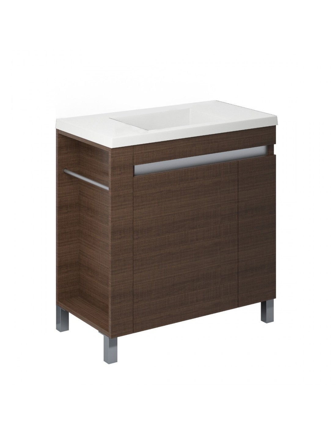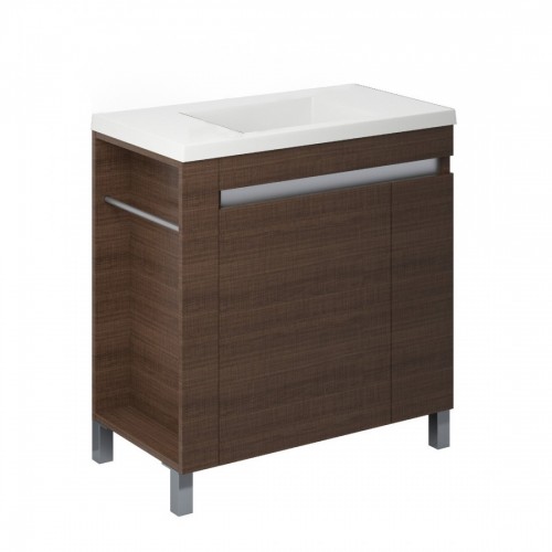 Fabricado en melamina resistente a la humedad, ofrece durabilidad y fácil mantenimiento. Su estructura cuenta con dos puertas amplias con tiradores integrados, que mantienen una estética limpia y moderna. Además, incluye una bacha de apoyo Aqualine, práctica y de diseño contemporáneo, que completa el conjunto con un toque sofisticado.