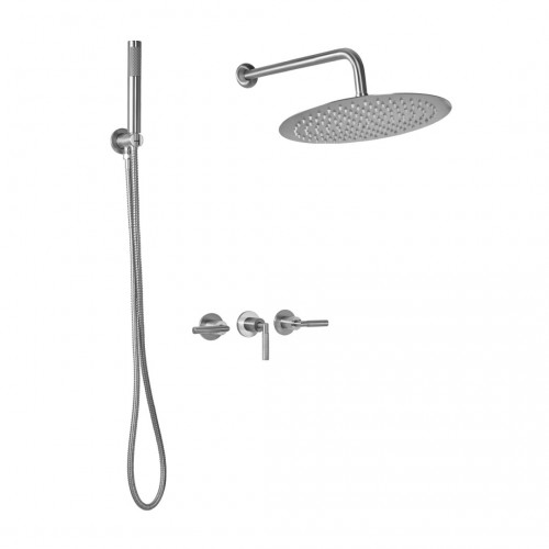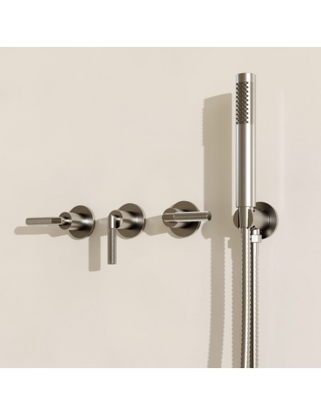Grifería de ducha bicomando de la Línea Beat Níquel de Peirano con cierre cerámico, cuerpo metálico y duchador manual. Acabado níquel pulido de alta resistencia y garantía de 5 años.