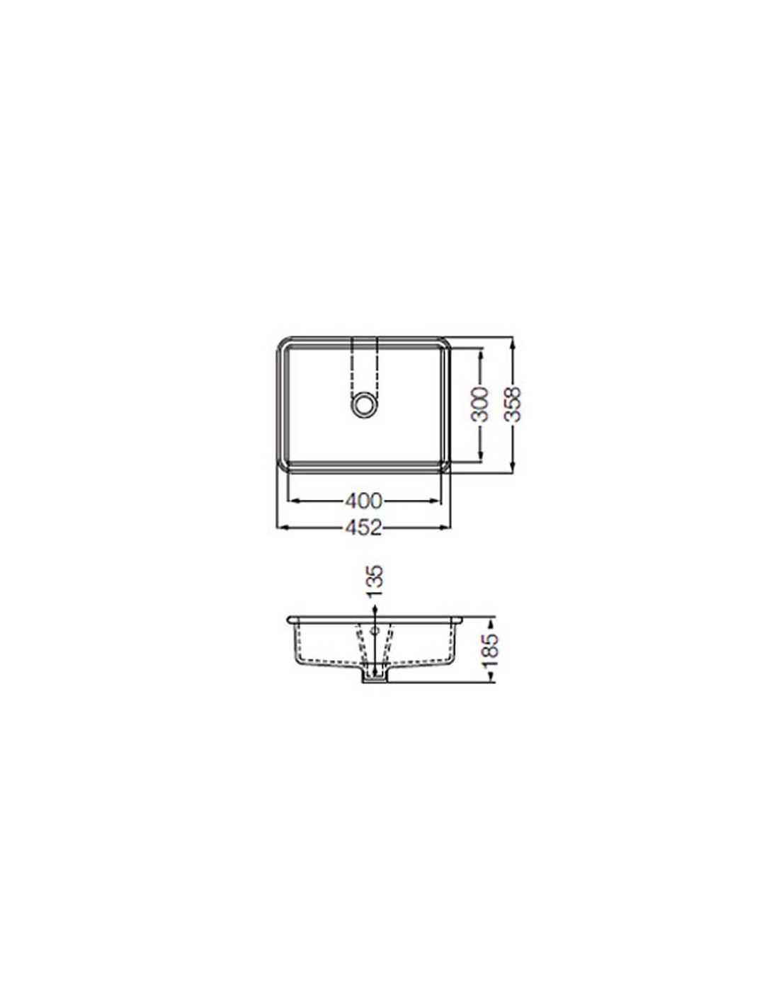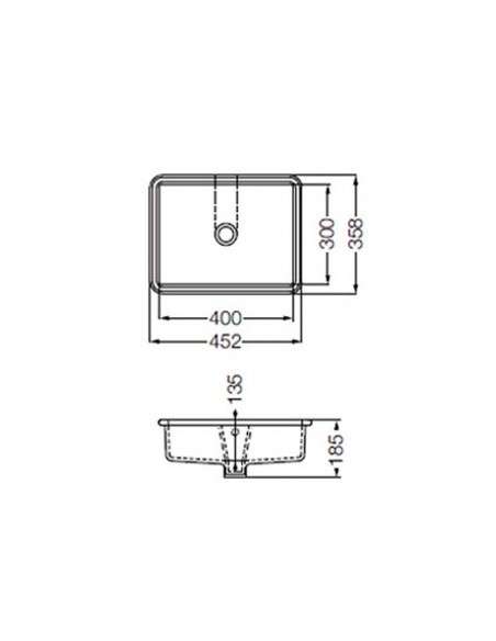 Bacha para encastrar, bajo mesada, de diseño clásico con forma rectangular, fabricada en porcelana sanitaria de color blanco de fácil limpieza. Posee unas medidas de 45,2 cm por 35,8 cm. Imagen ilustrativa, NO INCLUYE TAPON NI GRIFERIA.