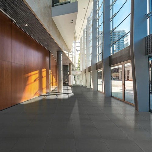 Porcelanato de formato rectangular de 60cm por 60cm y 9mm de espesor, de color gris oscuro con acabado mate. Posee bordes rectificados para una sensación de mayor continuidad y amplitud en la superficie debido al menor espacio de juntas entre los porcelanatos. De diseño ideal gracias a su adaptabilidad a cualquier ambiente.